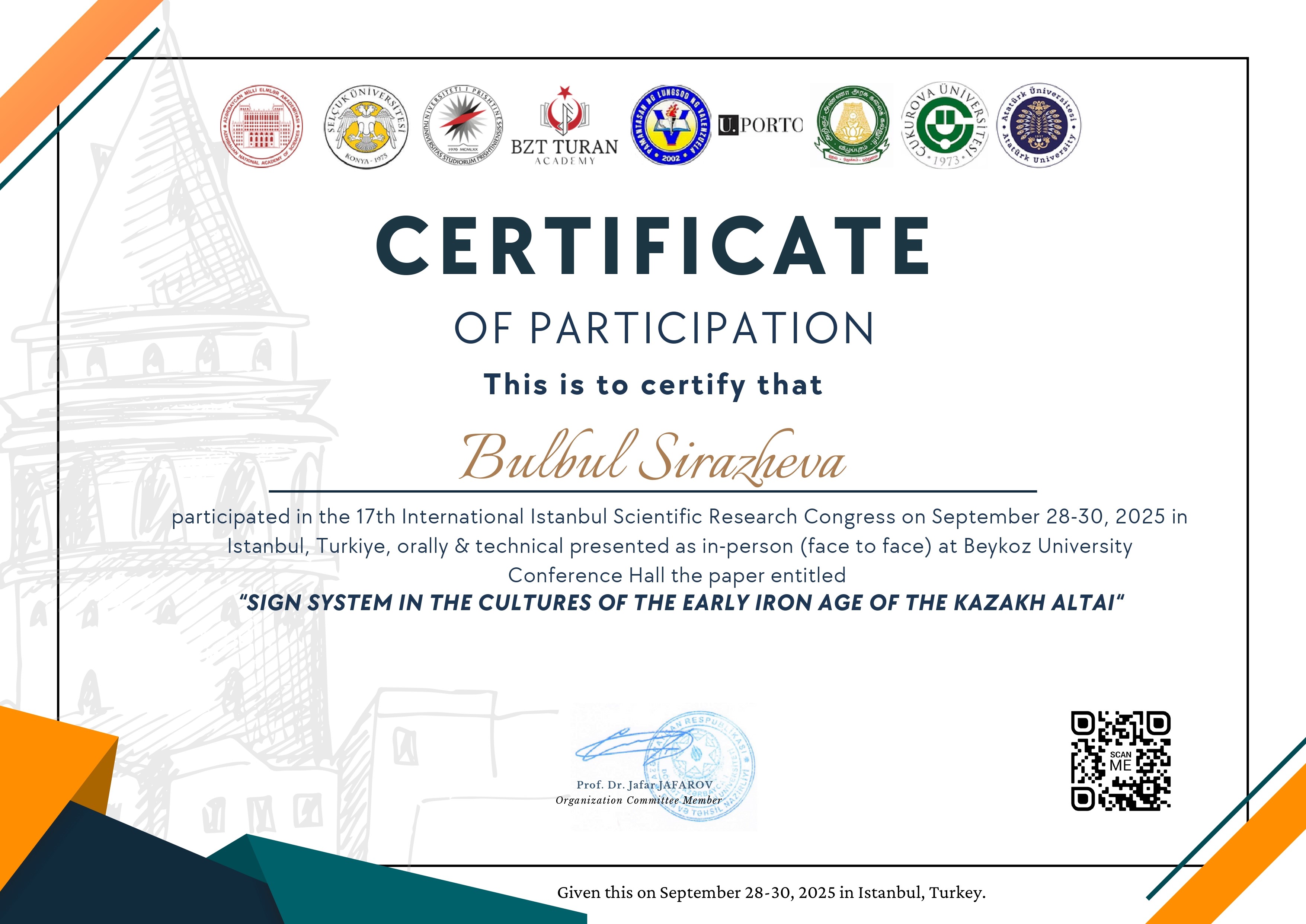 In Istanbul, within the framework of the 17th International Istanbul Scientific Studies Congress, a presentation was delivered on the topic “ Sign system in the cultures of the Early Iron Age of the Kazakh Altai.”